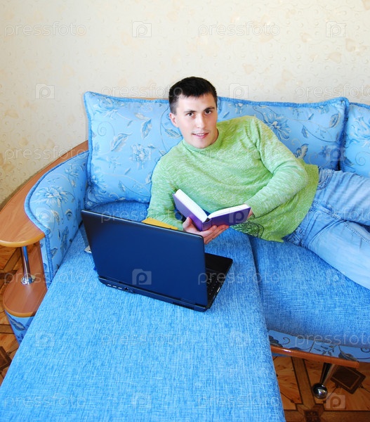 Мужчина лежит на диване с ноутбуком и книгами