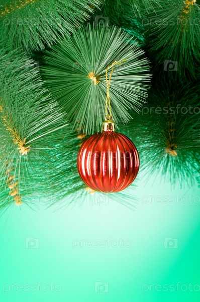 Красный рождественский шарик на ветке крупным планом на зеленом фоне