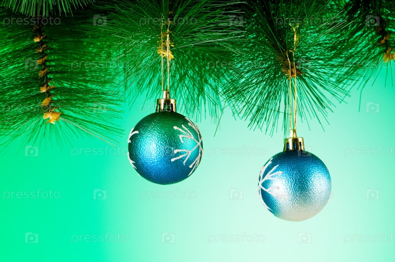Два разноцветных шарика на елке крупным планом