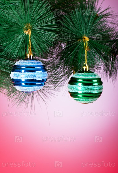 Два новогодних шарика на ветке крупным планом на розовом фоне