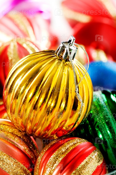 Разноцветные елочные игрушки крупным планом