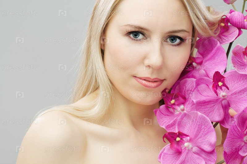 Красивая цветочная девушка на сером фоне