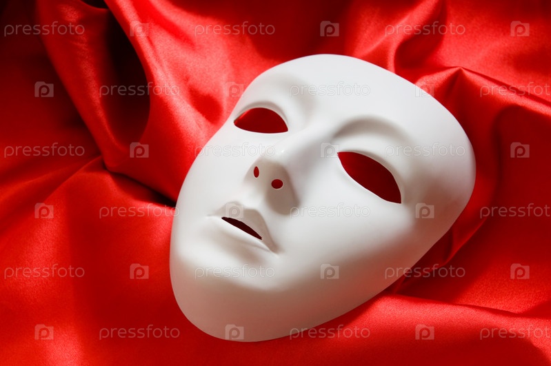 Театральная маска на фоне красной ткани крупным планом