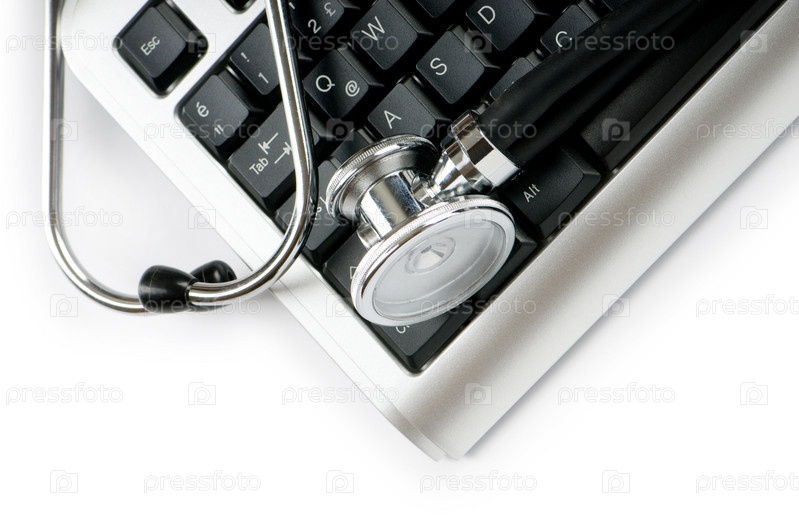 Медицинский стетоскоп и клавиатура крупным планом