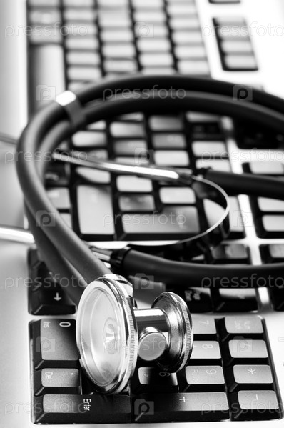 Клавиатура и медицинский стетоскоп крупным планом