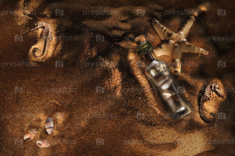Морские ракушки и камни в бутылке на фоне морского пляжа.Фотография сделана с помощью техники лайфброш.Небольшое освещение