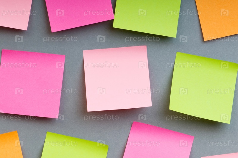 Разноцветные стикеры на сером фоне крупным планом