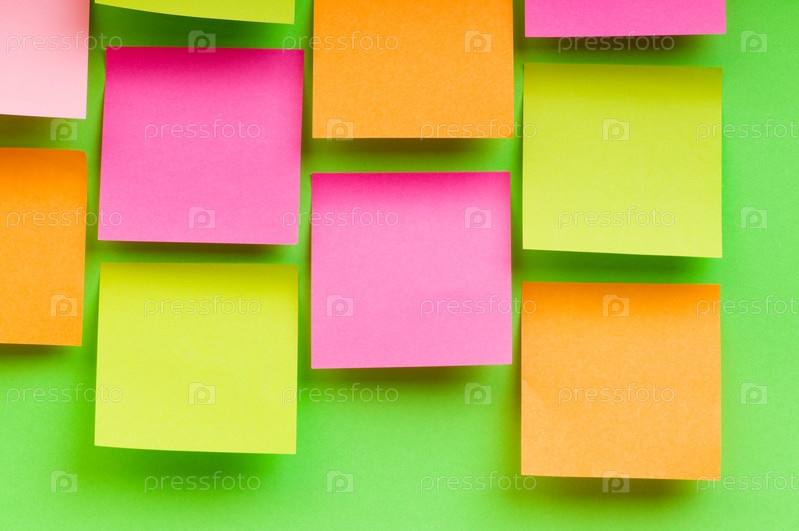 Разноцветные стикеры на зеленом фоне крупным планом