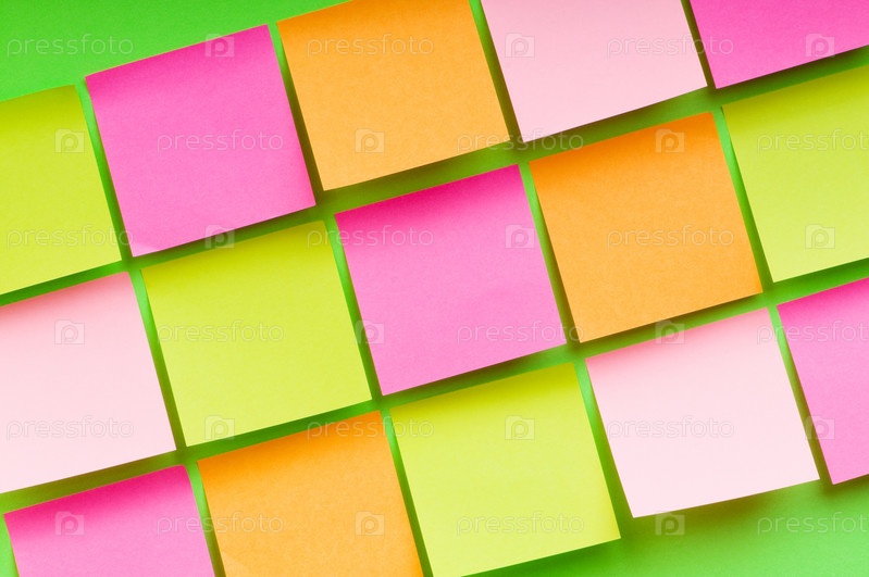 Много цветных стикеров на зеленом фоне крупным планом