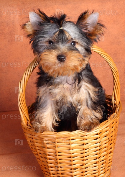 Милый йоркширский терьер в плетеной корзине