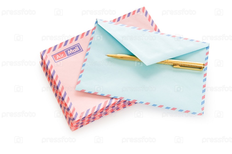 Почтовые конверты и ручка на белом фоне