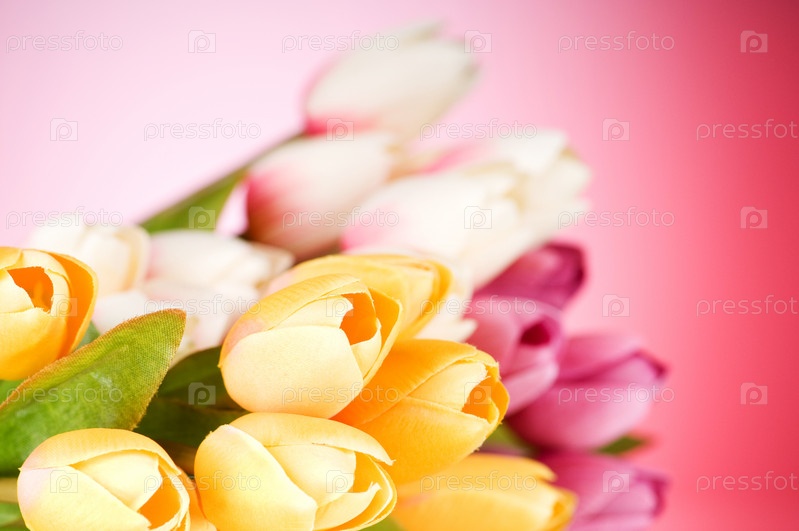 Букет тюльпанов крупным планом на розовом фоне