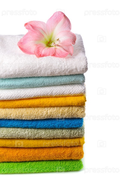 Стопка махровых полотенец, украшенных цветком амариллиса