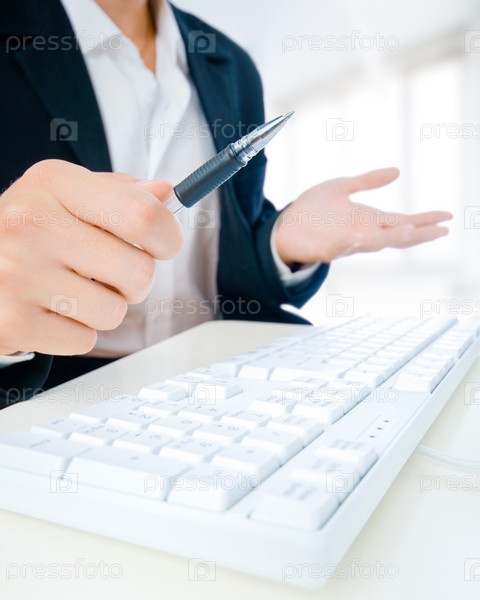 Близкий снимок руки секретарши, касающейся клавиш компьютера