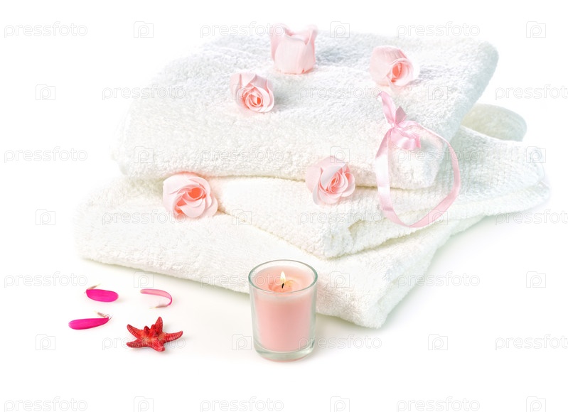 Стопка махровых белых полотенец, свеча и розы
