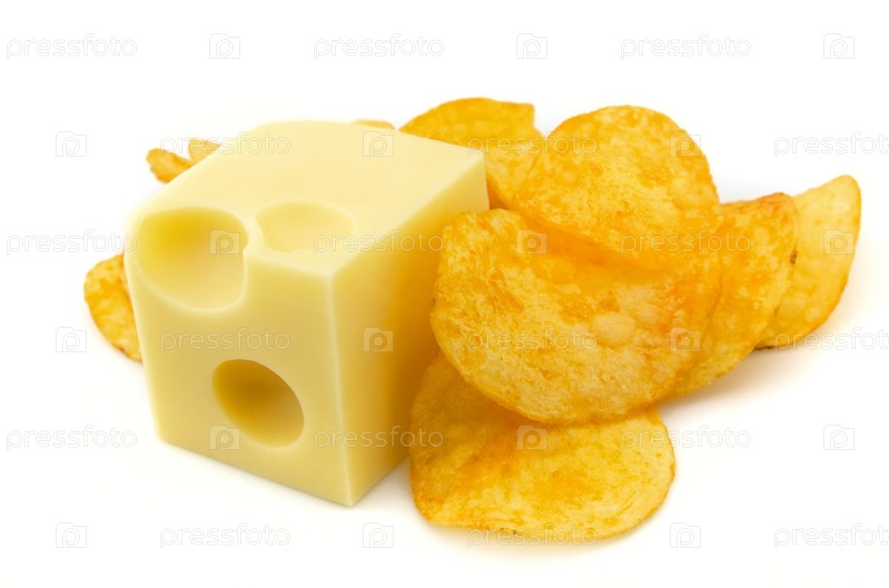 Кусок сыра и чипсы на белом фоне