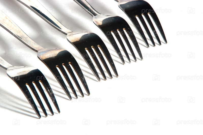 Ряд из пяти вилок на белом фоне