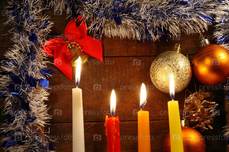 Четыре горящие свечи на фоне рождественских украшений