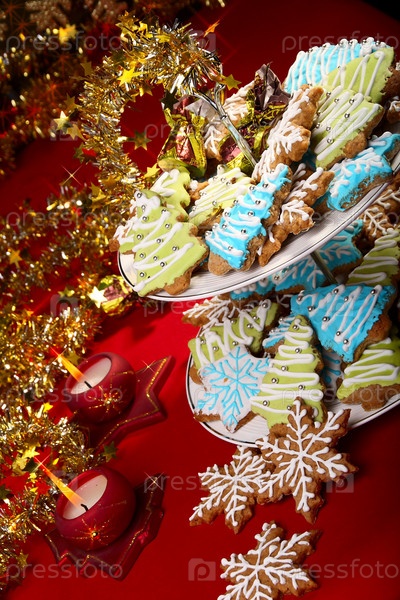 Имбирное печенье на фоне рождественских украшений
