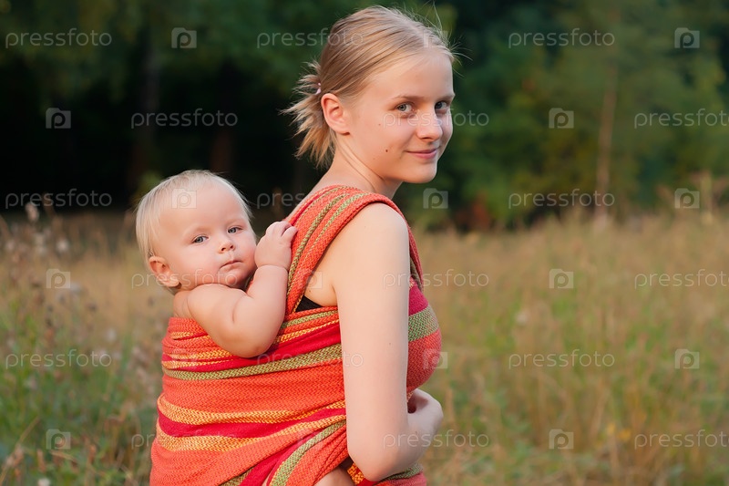 Молодая мать, несущая ребенка в слинге