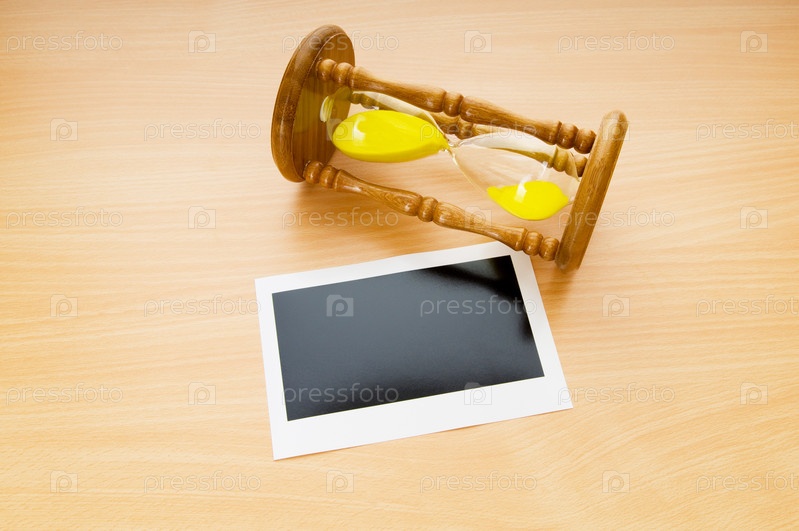 Пустая фоторамка для фотографий и песочные часы лежат на столе