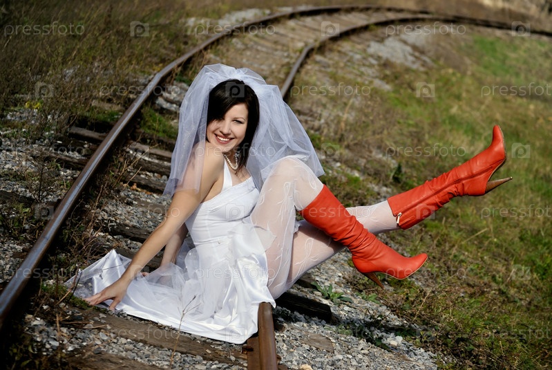Женщина в подвенечном платье сидит на рельсах