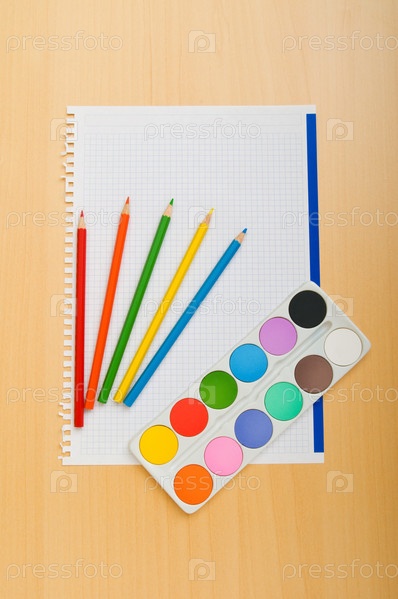 Разноцветные краски и цветные карандаши лежат на листе бумаги