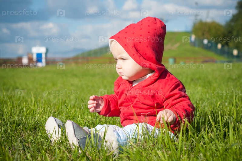 Маленький ребенок в красной кофточке сидит на зеленой траве