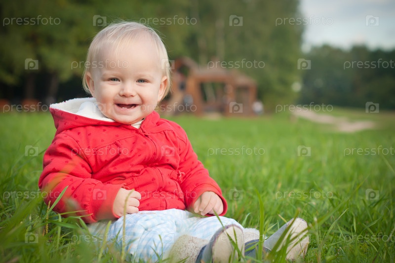 Маленький ребенок в красной кофточке сидит на зеленой траве