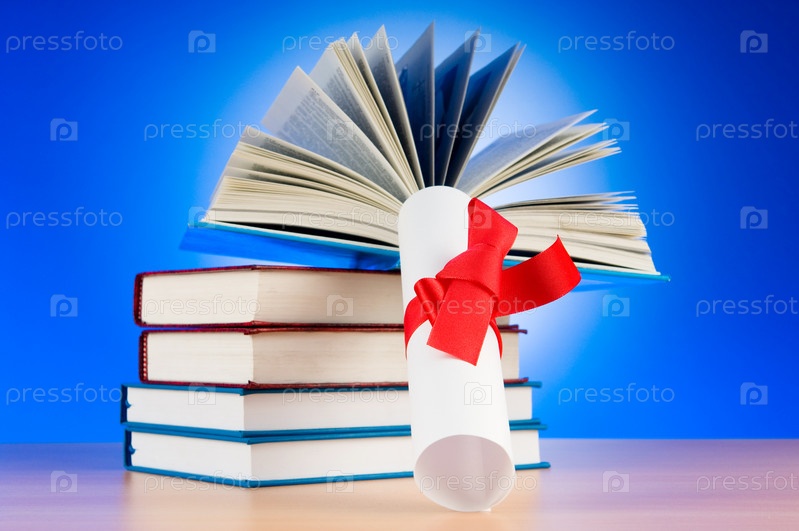 Диплом и стопка книг на синем фоне