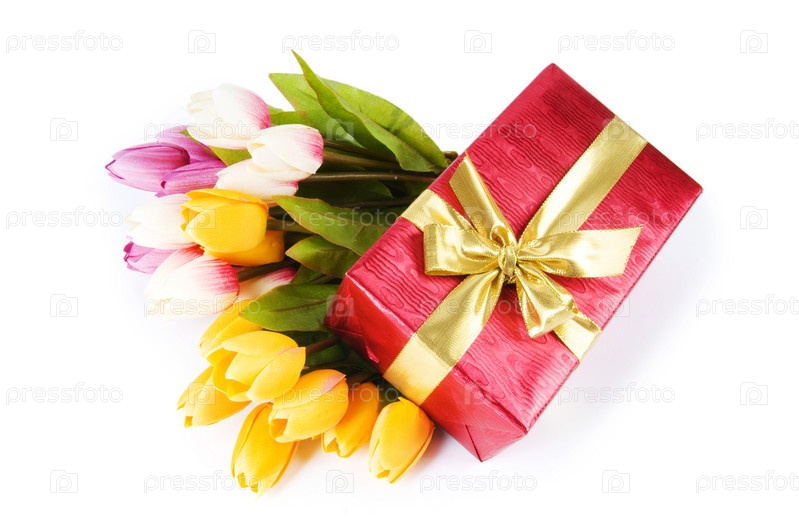 Букет тюльпанов и подарок на белом фоне