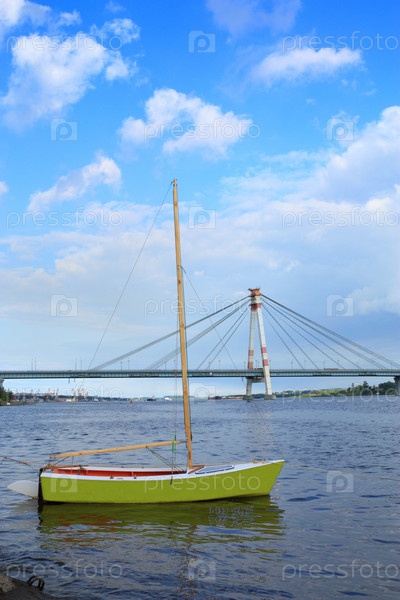 Маленькая парусная лодка против парня моста. город Череповец. Россия