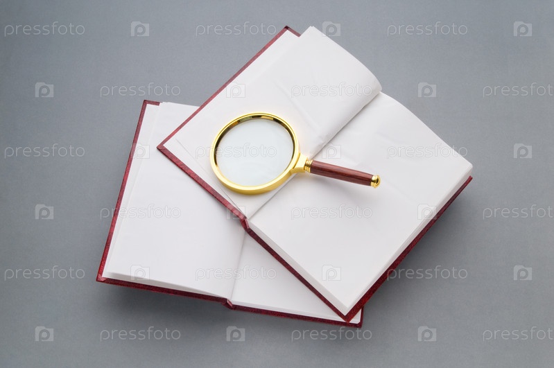 Лупа с деревянной ручкой, лежащая на раскрытой книге на сером фоне