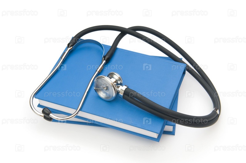 Стетоскоп, лежащий на книгах на белом фоне