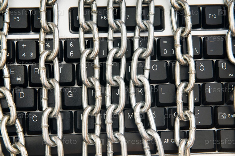 Компьютерная клавиатура, обвернутая стальной цепью