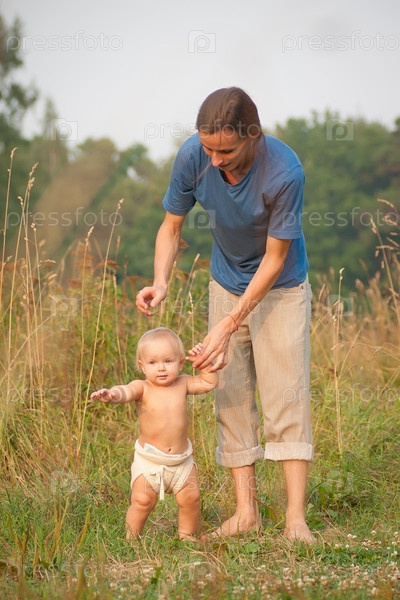Отец гуляет с дочкой по траве