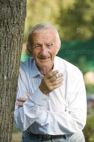 Пожилой мужчина держит в руке сигарету
