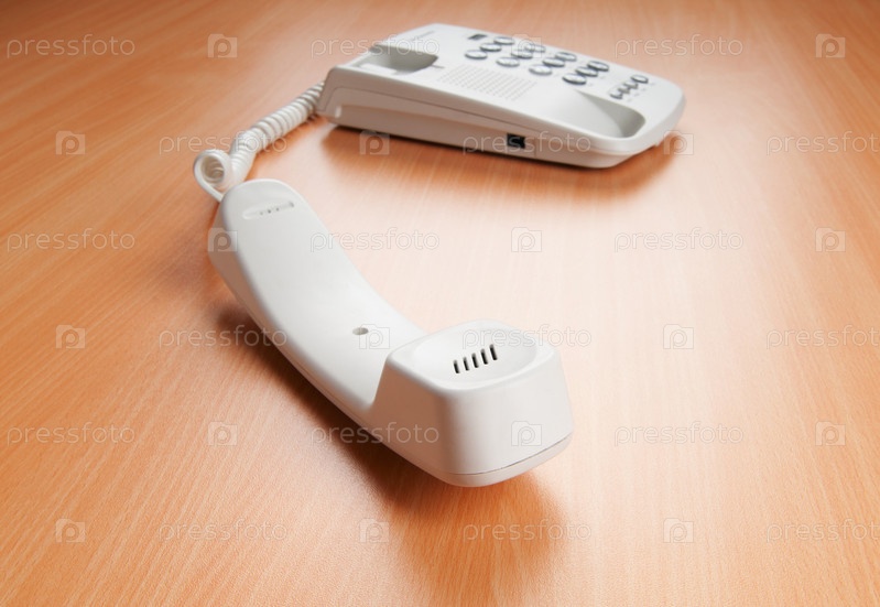Белый телефонный аппарат на деревянном столе