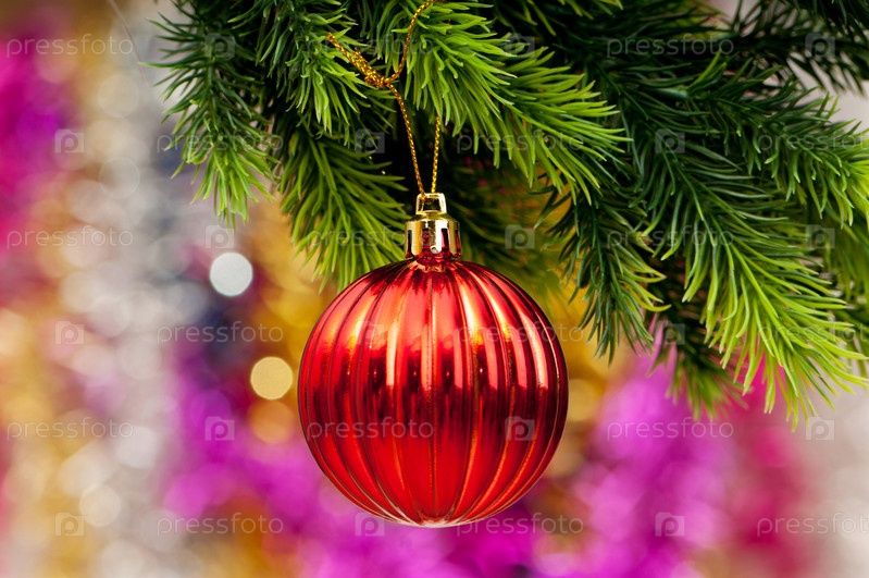 Новогодний красный шарик, висящий на еловой ветке