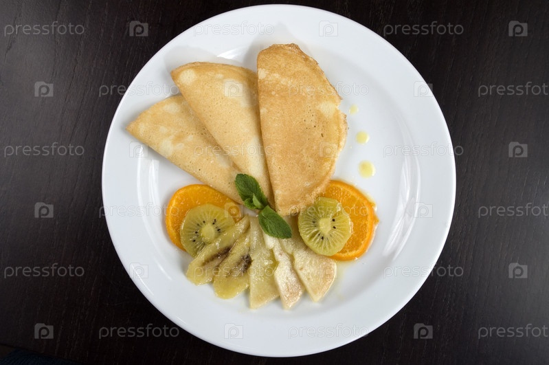 Блинчики с фруктами на белой тарелке