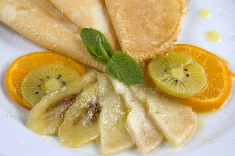 Блинчики с фруктами на белой тарелке