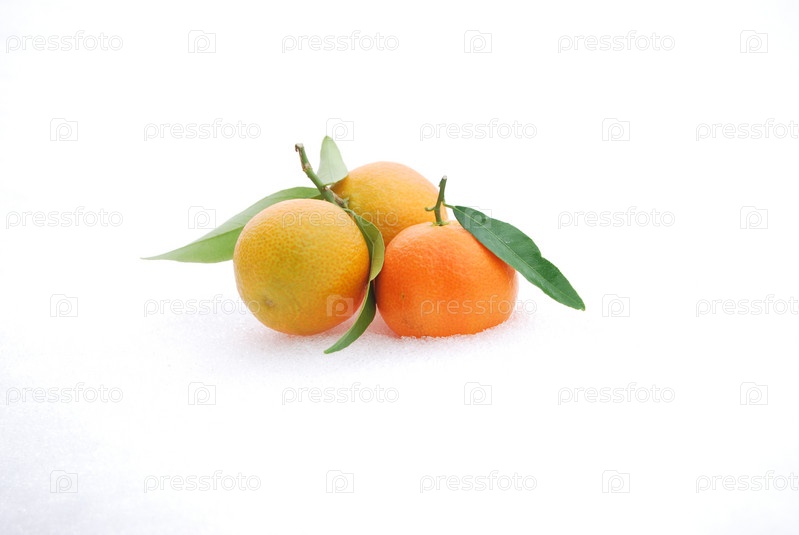 Три мандарина с листочками на снегу