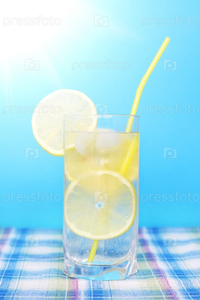 Стакан воды с ломтиками лимона на голубом фоне
