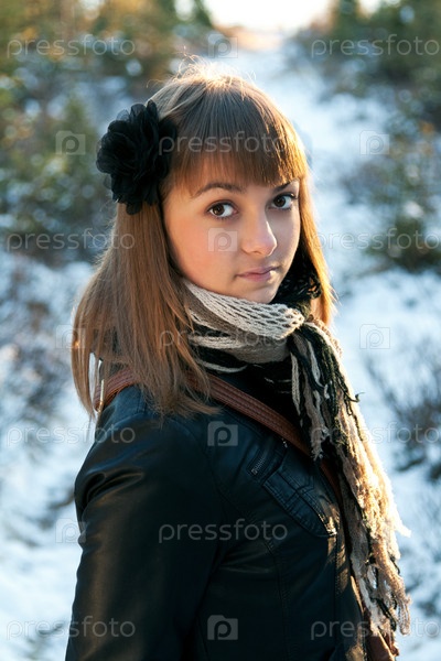 Портрет молодой девушки в зимнем лесу