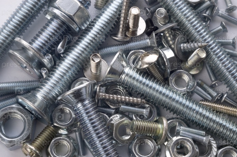 Металлические винты, болты и гайки на белом фоне