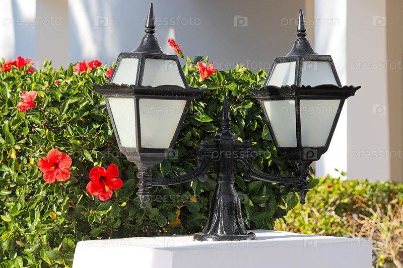 Декоративные фонари на стенде, на фоне куста