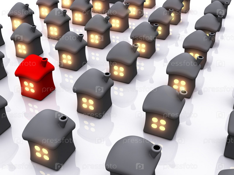 Трехмерное изображение красного дома среди серых на белом фоне