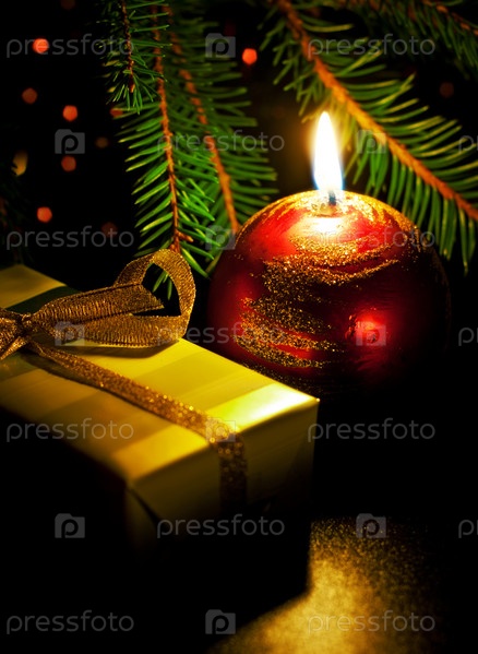 Рождественская композиция со свечой, еловыми ветками и подарком
