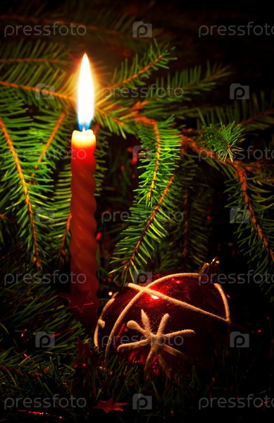 Горящая свеча, елочная игрушка и еловые ветви
