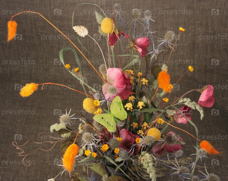 Букет и бабочка. Близкий план. Абстрактный натюрморт на текстильном льняном фоне
